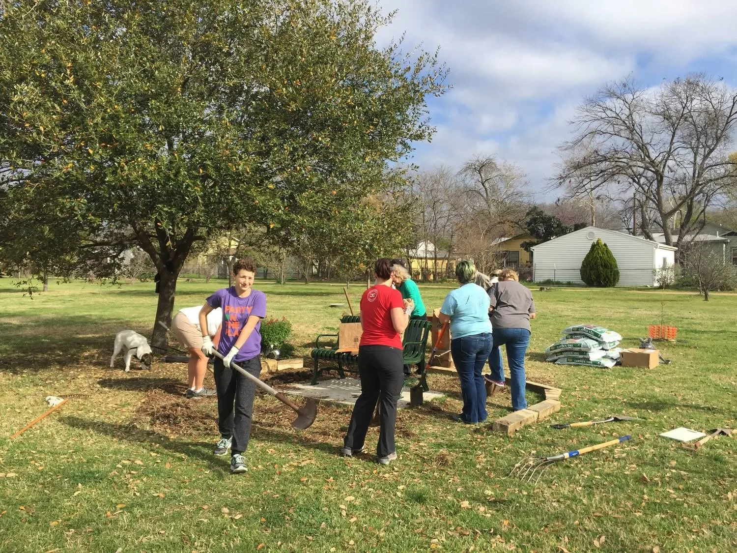 During the spring 2016 It’s My Park Day event, a new memorial planting bed was created around the Shelton bench. The limestone hardscape that surrounds the plating bed (and also the Welcome Bed) were brought over from the Shelton home by family members. A poetic farewell plaque was also added to the setting.