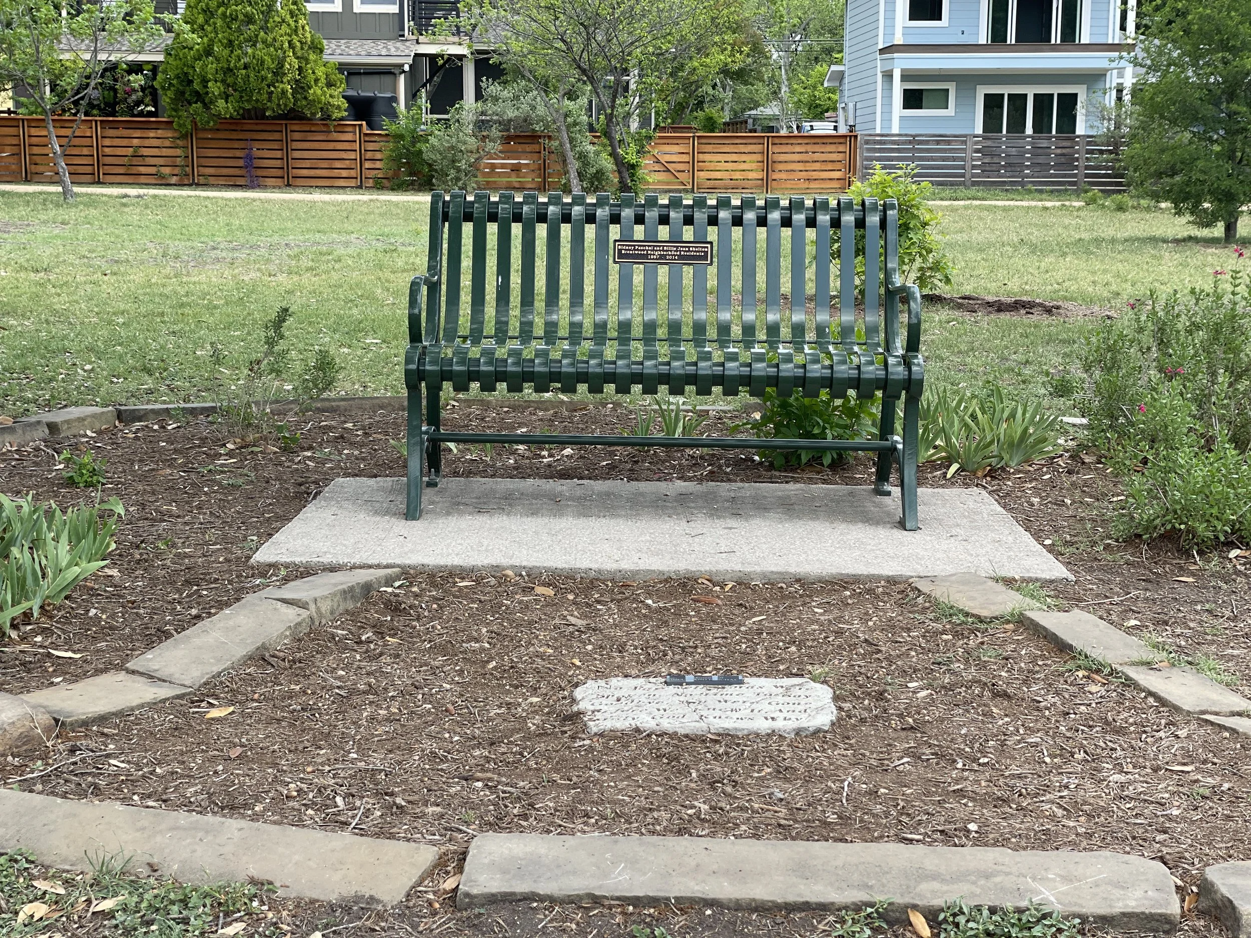 Soon after news spread, neighbors raised funds for a memorial bench honoring the Sheltons, and a park bench was installed in a peaceful spot near a tree 2015 between the playscape and baseball diamond in Brentwood Park.